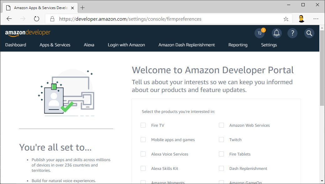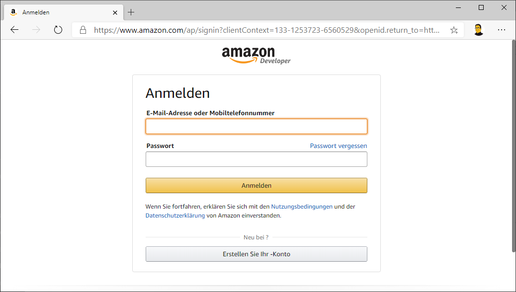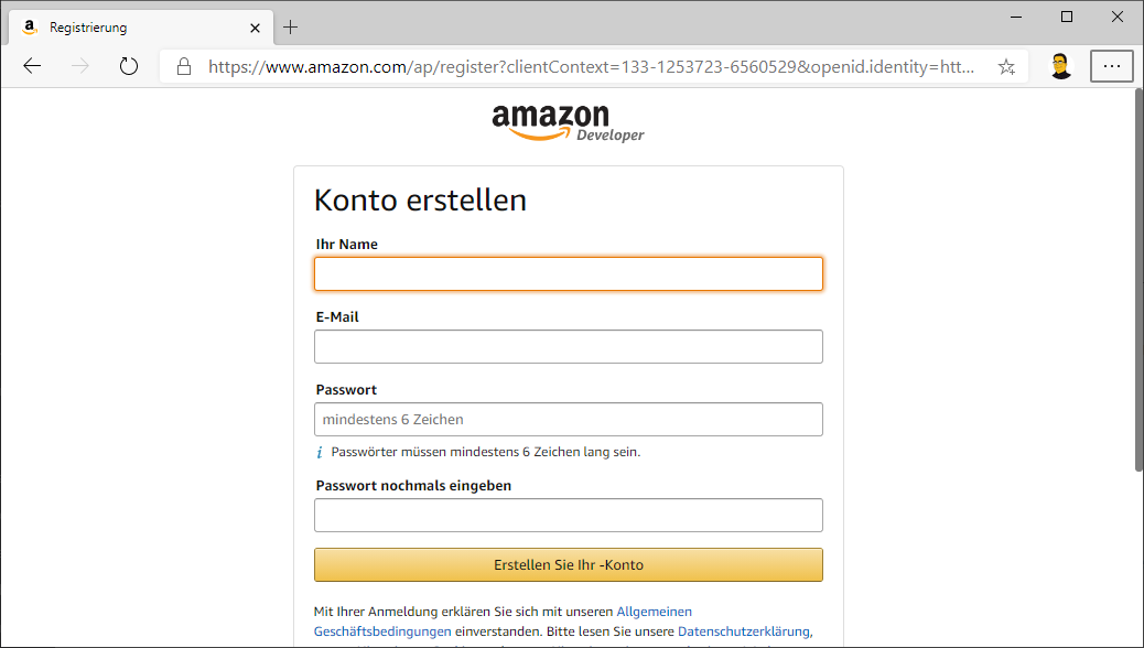 Im Anschluss werden wir direkt auf die Amazon Developer Konsole weitergeleitet.