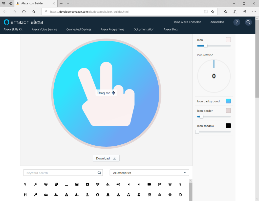 Bevor man seinen Alexa Skill bei Amazon zur Zertifizierung einreicht, muss man noch Icons bereitstellen, welche zum einen auf der Amazon Webseite und zum anderen auch innerhalb der App als Wiedererkennungswert verwendet wird. Hierfür hat nun Amazon selbst ein kleines Tool bereitgestellt, welches es ermöglicht mit wenigen Klicks ein entsprechendes Icon in den passenden Größen zu erzeugen.