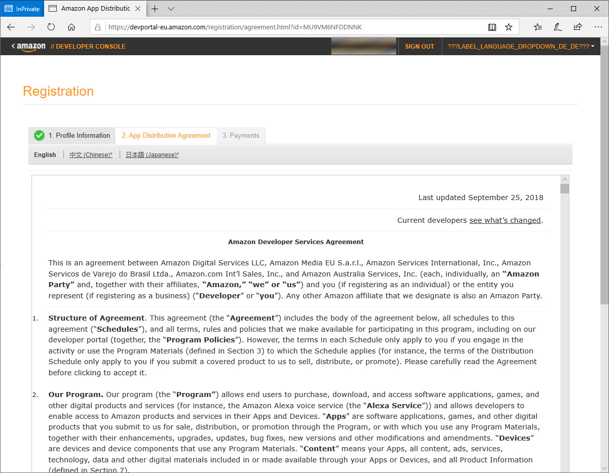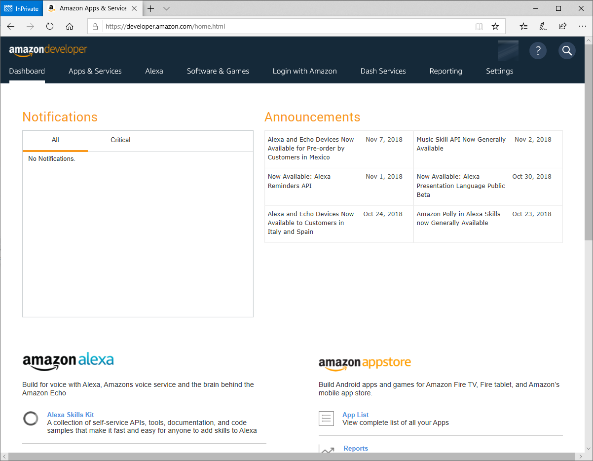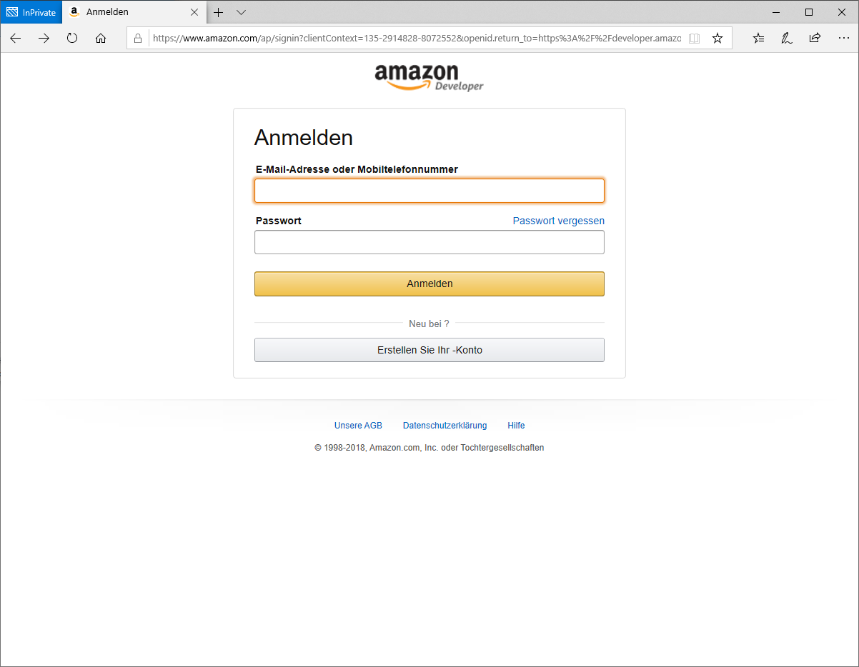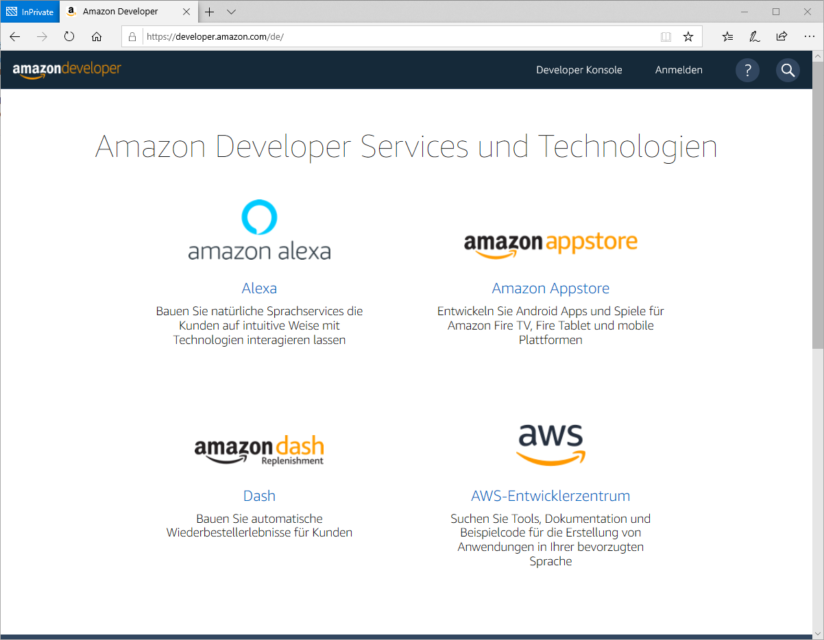 Der Einstiegspunkt dabei ist die Webseite https://developer.amazon.com , welche man im Browser seiner Wahl öffnen muss.