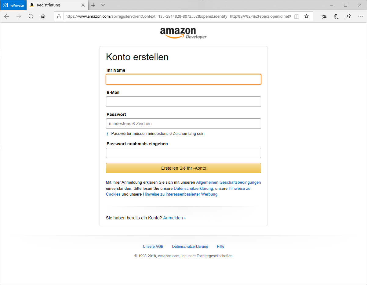 Sofern man bereits einen „normalen“ Amazon-Account besitzt, kann man sich mit diesem auch hier anmelden. In meinem Fall wollen wir aber einen komplett neuen Account erstellen und klicken dafür auf den Button Erstellen Sie Ihr Konto. Hier müssen wir neben einem Namen, einer E-Mail Adresse auch ein Passwort vergeben und schließen den Prozess über den Button Erstellen Sie Ihr Konto ab.