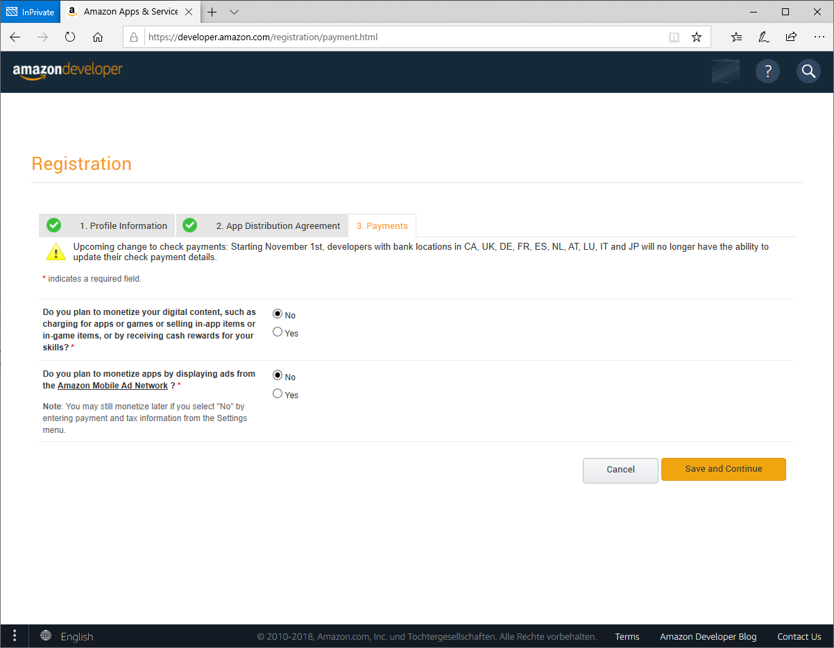 Hier geht es darum, ob man mit seinen Skills bzw. Apps später Geld verdienen möchten. Dieses lässt sich auch zu einem späteren Zeitpunkt beantworten und daher wählen wir hier bei beiden Fragen No als Antwort aus und bestätigen mit Save and Continue.