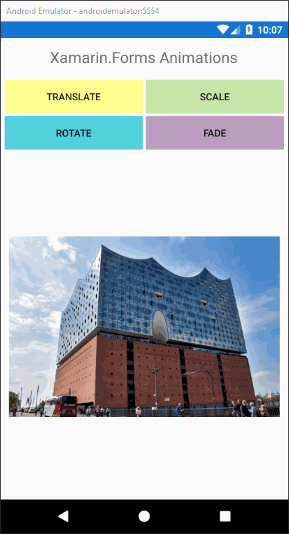 Für die Animationen ist kein zusätzliches NuGet-Package notwendig, sondern alles ist bereits im Xamarin.Forms-Package enthalten. Ich habe eine kleine Demo-Anwendung erstellt, welche die verschiedenen Animationstypen (Transformation, Skalierung, Rotation und Fade) an einem Bild verdeutlicht. Das Ergebnis zeigt die folgende Gif-Datei: