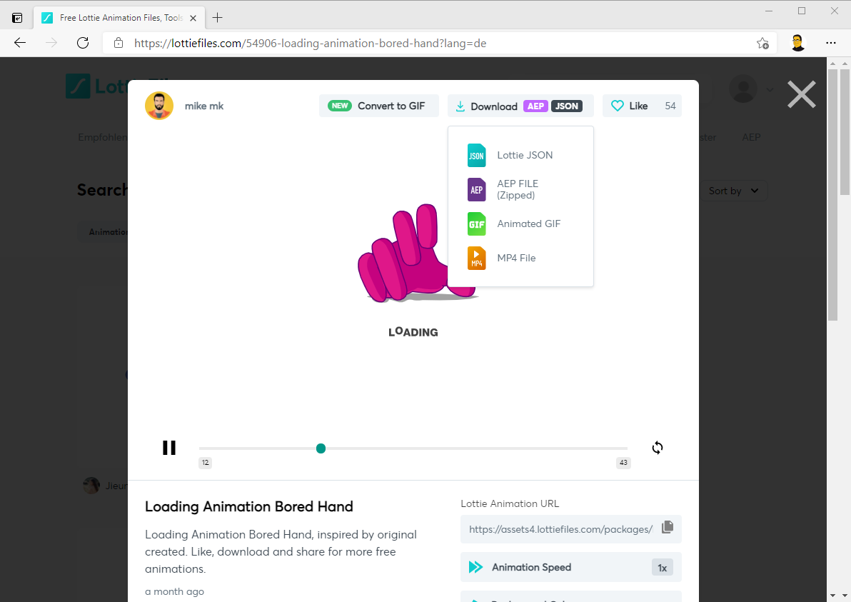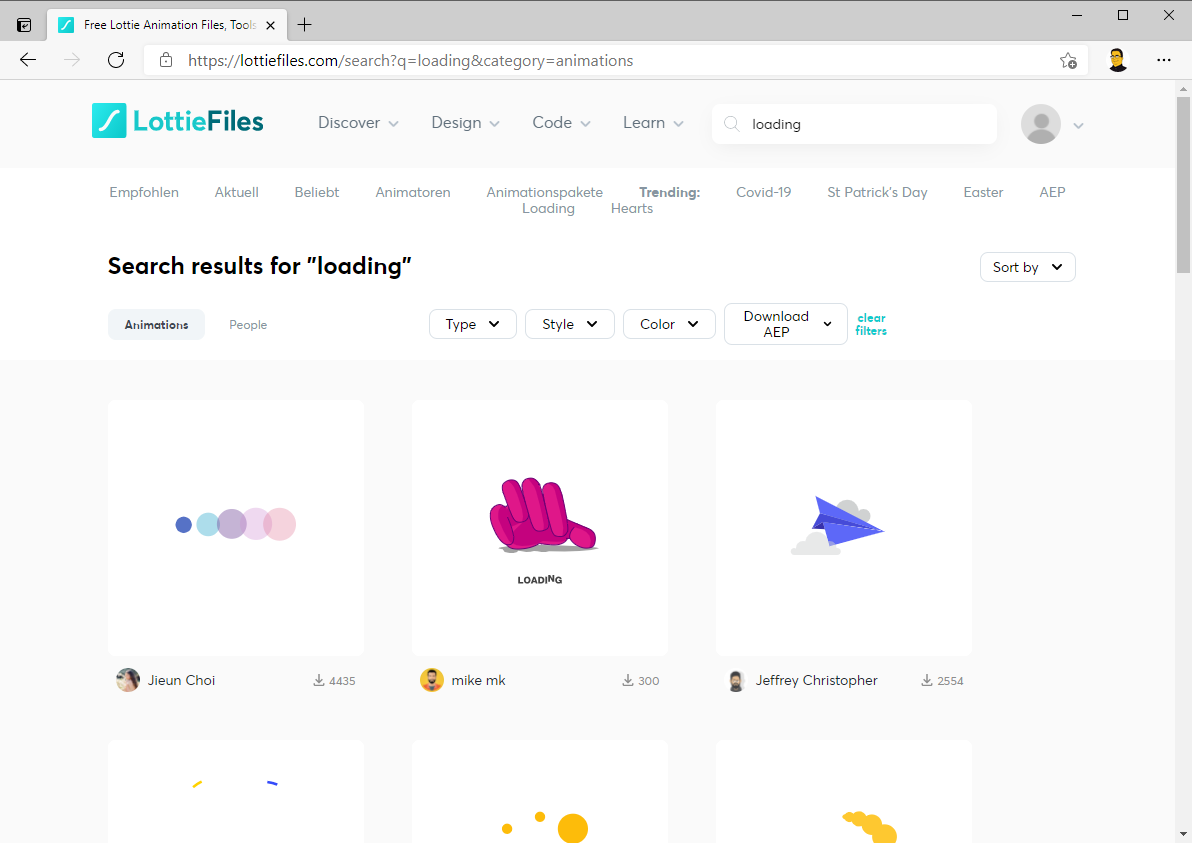 Nun benötigen wir noch eine entsprechende Animation. Dazu öffnen wir die Webseite lottiefiles.com in einem Browser. Es wird ein kostenloser Account benötigt, welcher sich ganz einfach anlegen lässt. Da ich eine Ladeanimation anzeigen möchte, suche ich nach Loading.