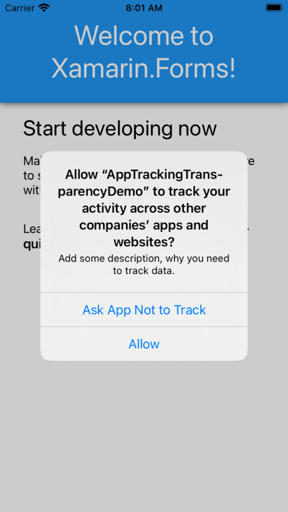 Wenn wir die App nun einmal unter iOS ausführen, so wird uns beim ersten Starten der App nun der folgende Dialog angezeigt.