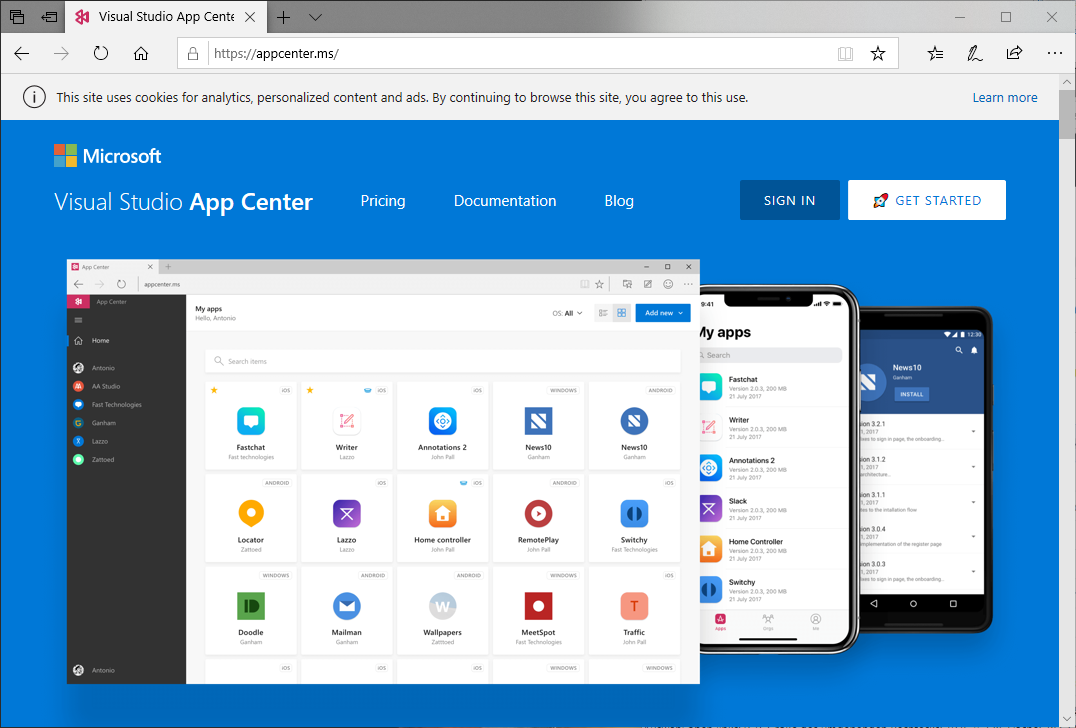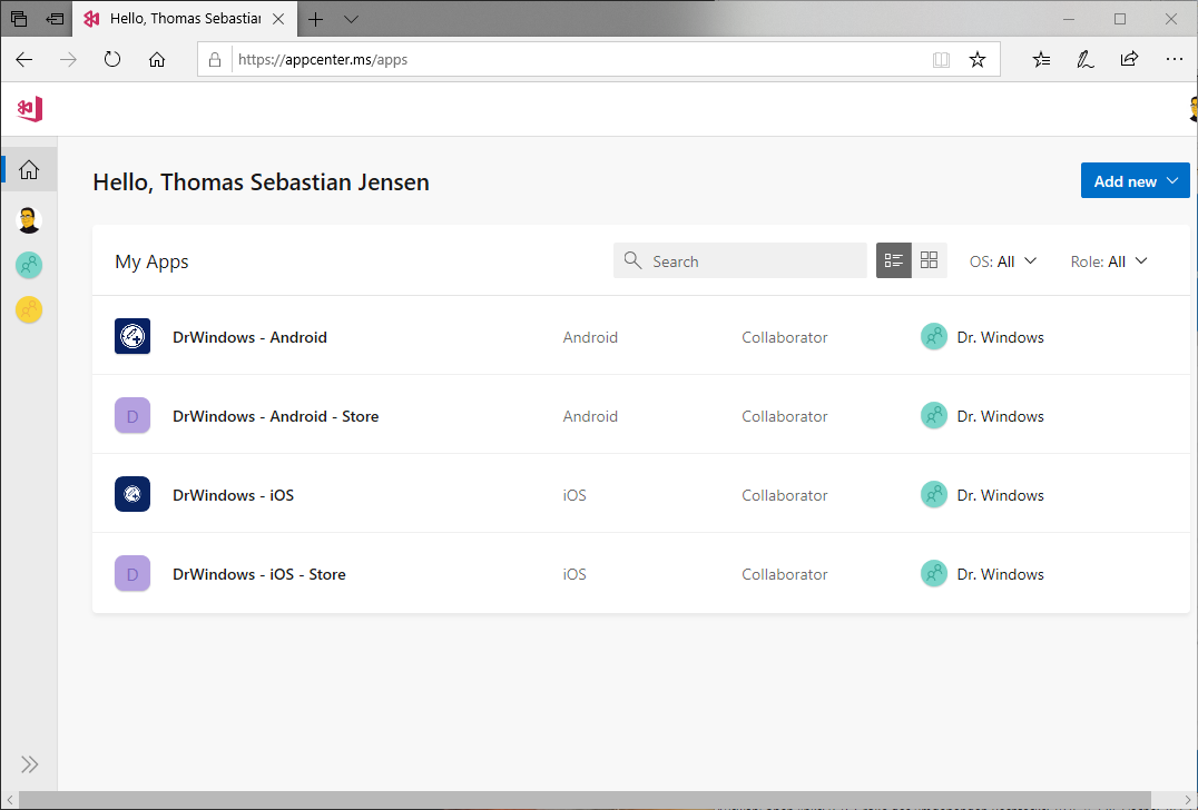 Das Web-Portal des AppCenters erreicht man über https://appcenter.ms .