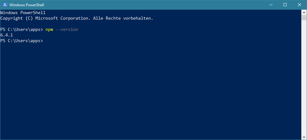 Nach der Installation können wir PowerShell öffnen und über den Befehl node --version oder npm --version überprüfen, ob die Installation erfolgreich war.