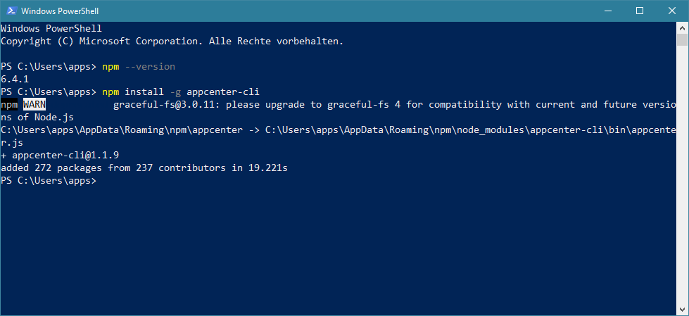 Anschließend können wir das entsprechende Paket mit der Hilfe von npm installieren. Hierzu geben wir npm install -g appcenter-cli als Befehl ein. Die Installation des Pakets nimmt ein paar Sekunden in Anspruch.