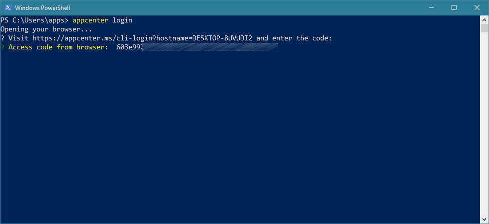 Nun steht und der Command appcenter in PowerShell zur Verfügung. Zunächst müssen wir uns beim AppCenter anmelden. Dazu verwenden wir den Befehl appcenter login. Es öffnet sich ein Browserfenster, wo wir uns anmelden können und anschließend erhalten wir ein Token, welches wir in das PowerShell-Fenster einfügen und mit Enter bestätigen.