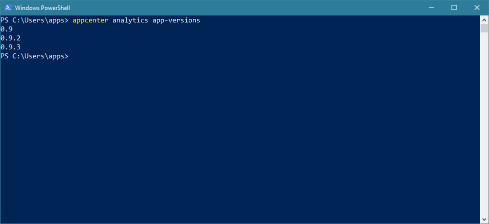Um nun zum Beispiel zu sehen, welche App-Versionen aktuell im Umlauf sind, können wir appcenter analytics app-versions verwenden und erhalten direkt die Antwort. Ebenso können wir über appcenter analytics app-versions --app APPNAME auch direkt die Versionen einer anderen App abfragen.