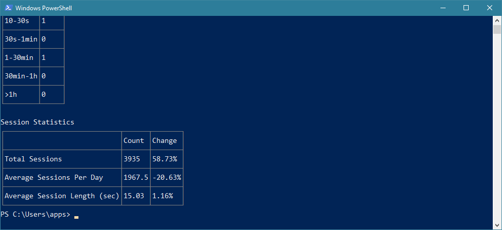 Über appcenter analytics sessions bekommen wir Zugriff auf Session-Daten für die App. Dazu zählen zum Beispiel die Angabe wie lange eine App-Session dauert oder auch wie viele App-Sessions es überhaupt gibt. Das Ergebnis wird dabei formatiert in einer Tabellen-Ansicht dargestellt.