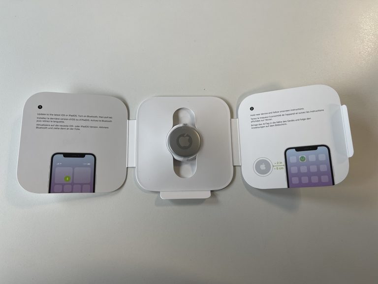 Im mittleren Fach findet man nun den eigentlichen AirTag und links und rechts noch ein paar weitere Hinweise zur Einrichtung des Geräts.