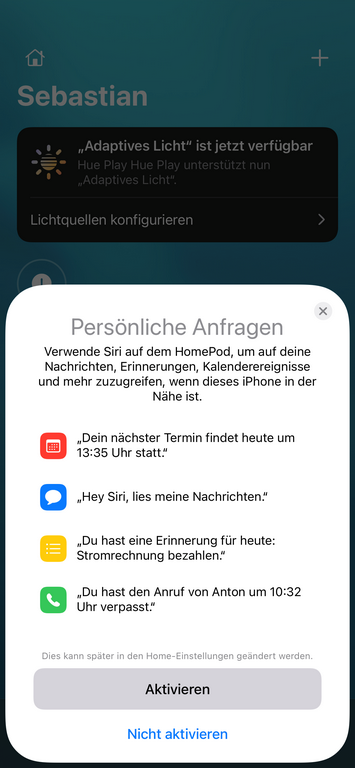 Anschließend wird abgefragt, ob man persönliche Anfragen genehmigen möchte. Damit bekommt der HomePod Zugriff auf den Kalender oder ist in der Lage Nachrichten oder Erinnerungen zu verwalten.