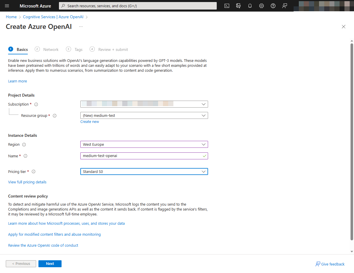 Derzeit musst du Zugriff auf die Azure OpenAI-Services beantragen. Du benötigst ein aktives Azure-Abonnement. Wenn dies der Fall ist, musst du das Antragsformular von Microsoft ausfüllen. Du musst verschiedene Fragen beantworten und Microsoft etwas Zeit geben, um deinen Antrag zu akzeptieren.