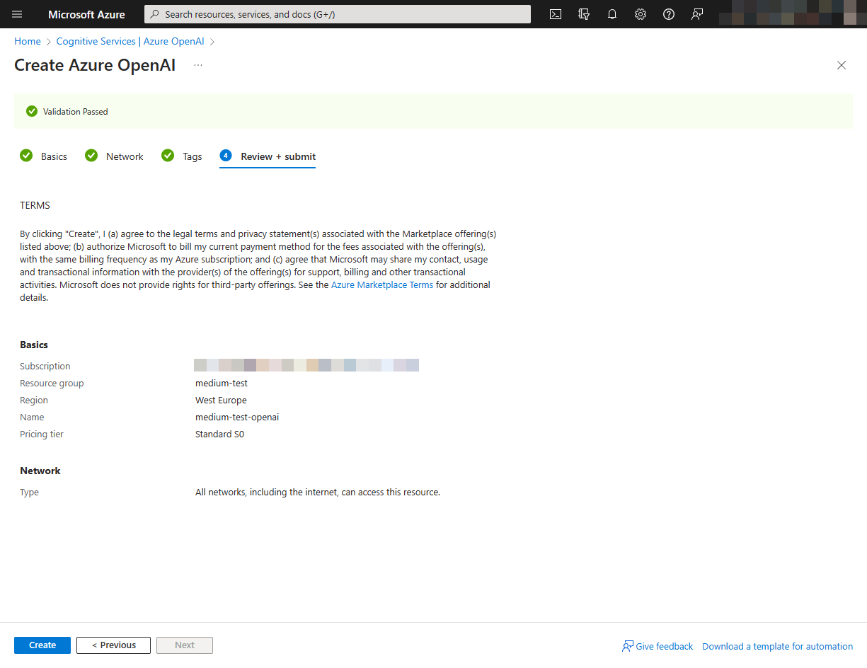 Wenn du Zugriff auf die Azure OpenAI-Services hast, kannst du das Azure-Portal öffnen und eine OpenAI-Ressource hinzufügen. Suche im Marktplatz nach „Azure OpenAI“. Stelle sicher, dass du das Abonnement auswählst, das Zugriff auf die Azure OpenAI-Services hat. Derzeit stehen nur vier Regionen zur Verfügung, also achte darauf, die nächstgelegene auszuwählen.