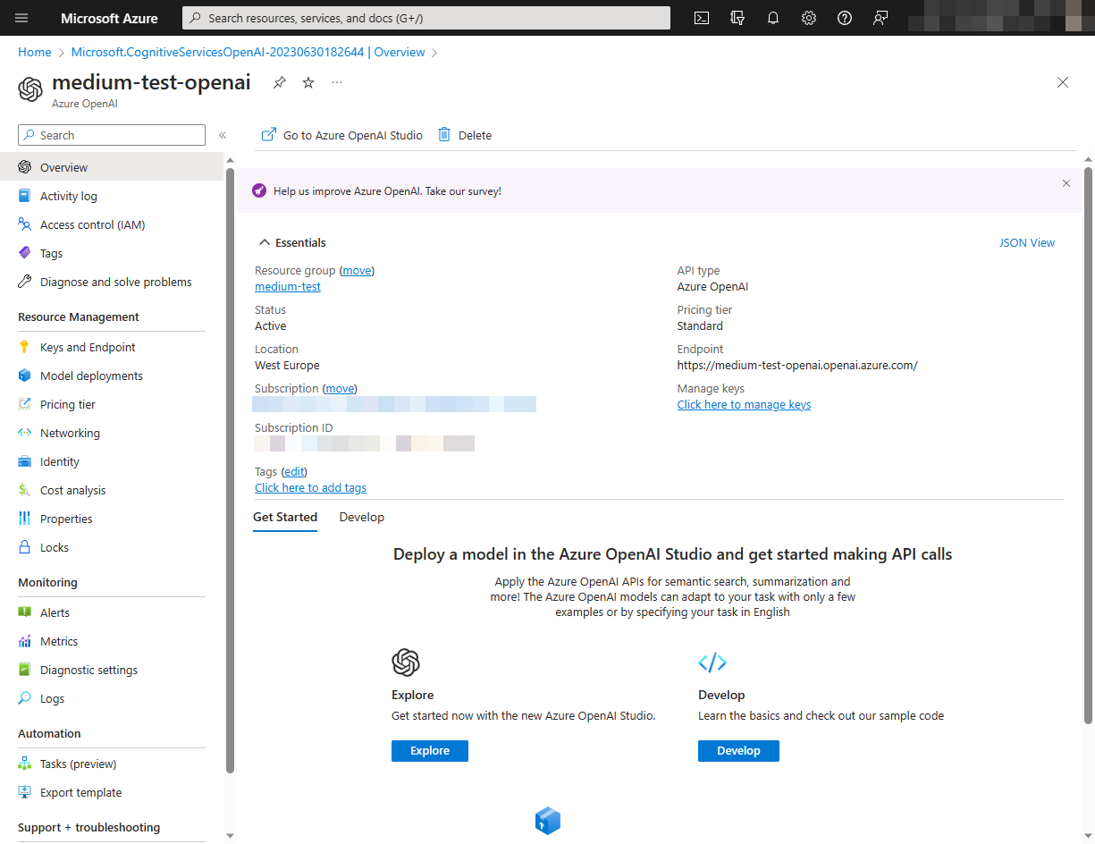 Öffne die neu erstellte Ressource im Azure-Portal und auf der Übersichtsseite klicke einfach auf den Link „Go to Azure OpenAI Studio“ oder den „Explore“-Button.