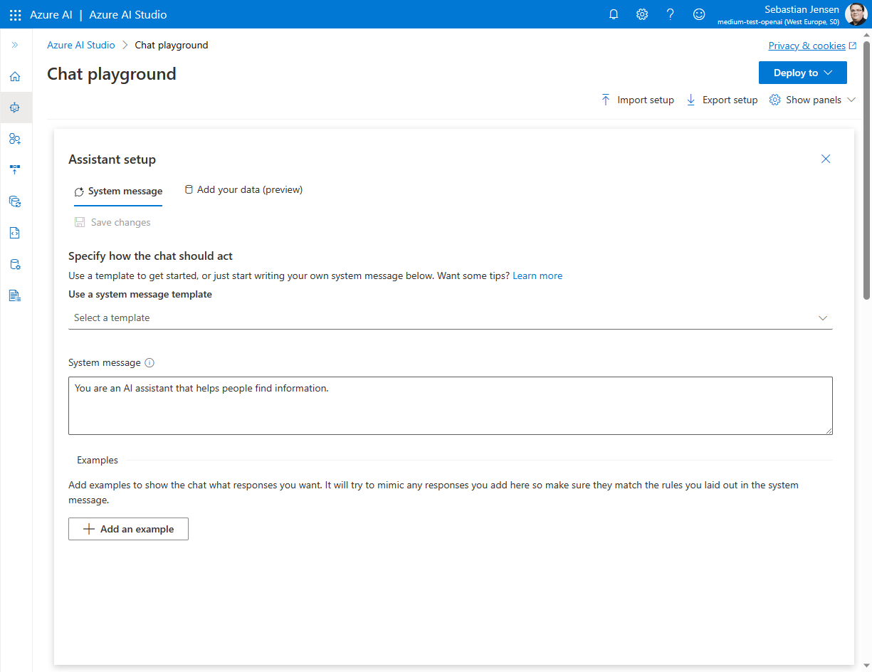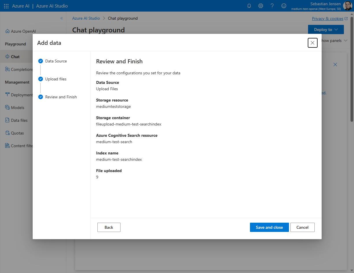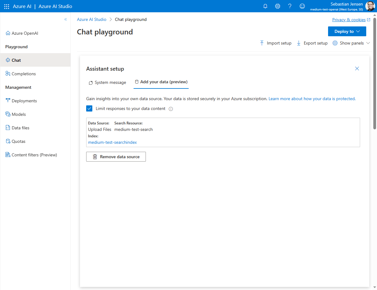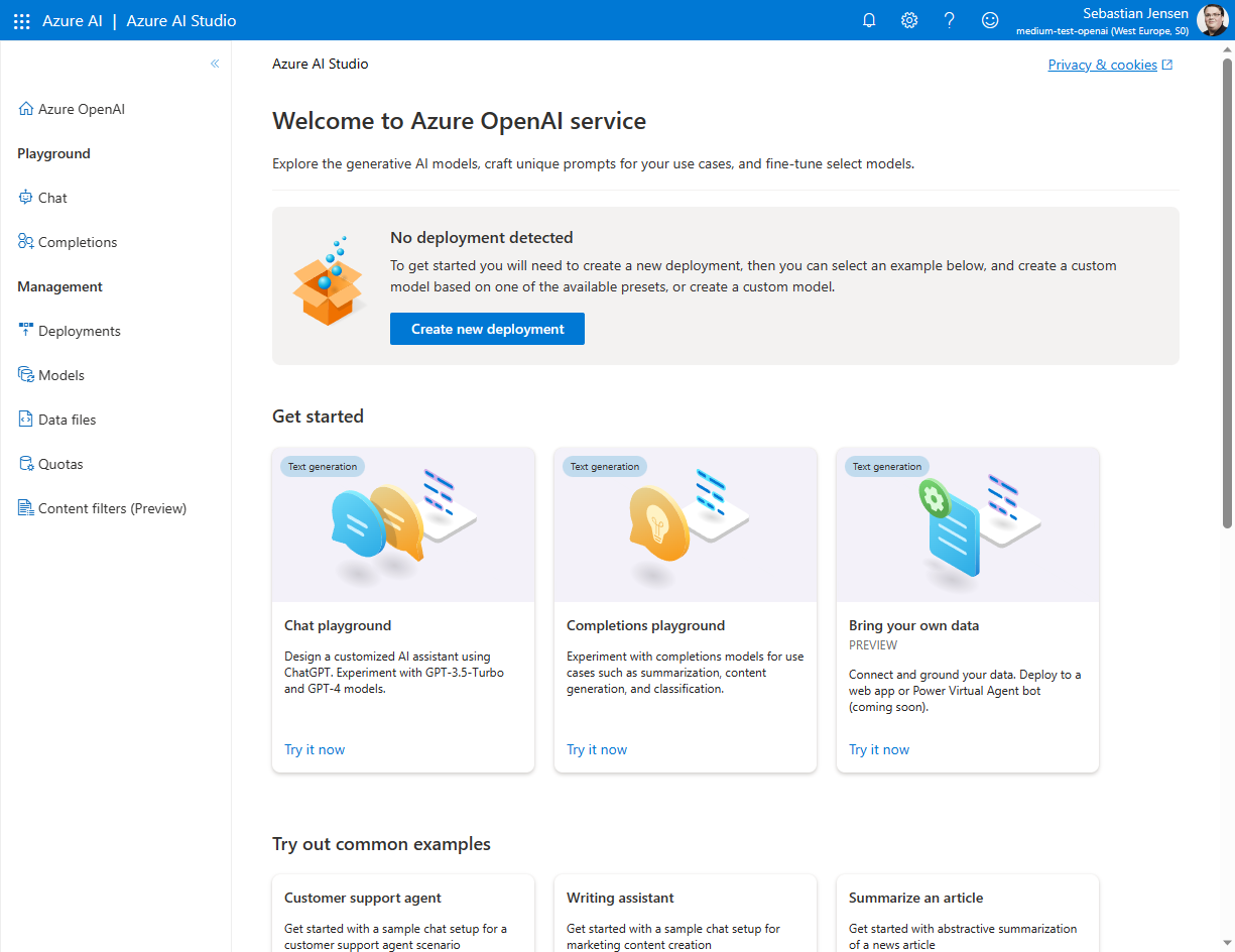 Jetzt haben wir den Azure OpenAI-Service eingerichtet. Im nächsten Schritt fangen wir an, unsere eigenen Daten hinzuzufügen.