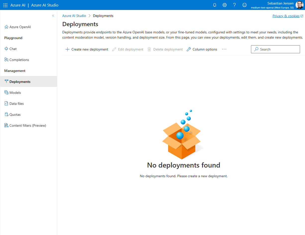 Du kannst je nach Bedarf mehrere Bereitstellungen in deinem Azure OpenAI-Service haben. Wir möchten die erste hinzufügen, indem wir auf den Link „Create new deployment“ klicken.