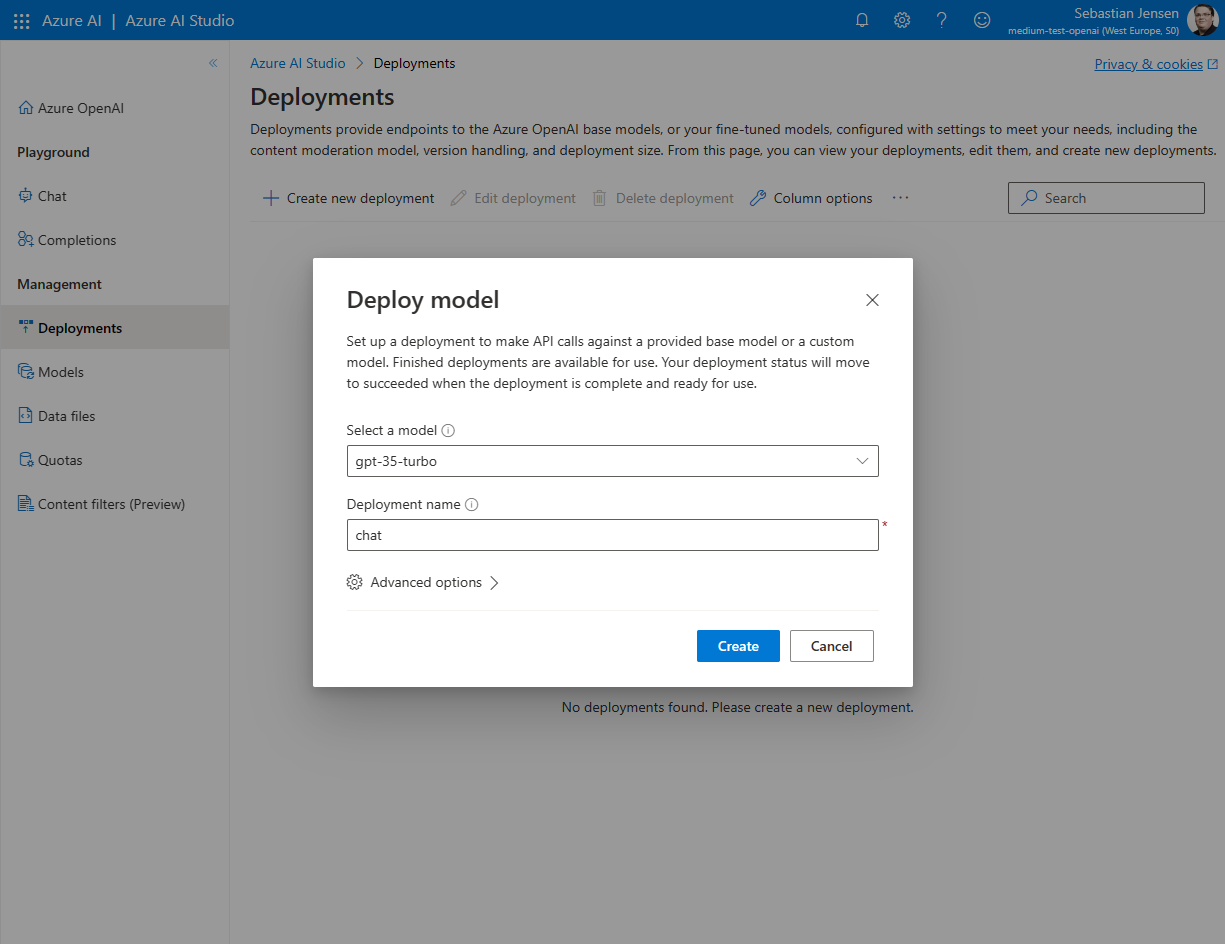 Ich werde das Modell „gpt-35-turbo“ auswählen und den Namen „chat“ für die Bereitstellung verwenden. Stelle sicher, dass du dir den Namen merkst, da wir ihn später benötigen.