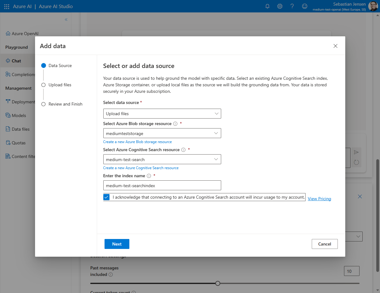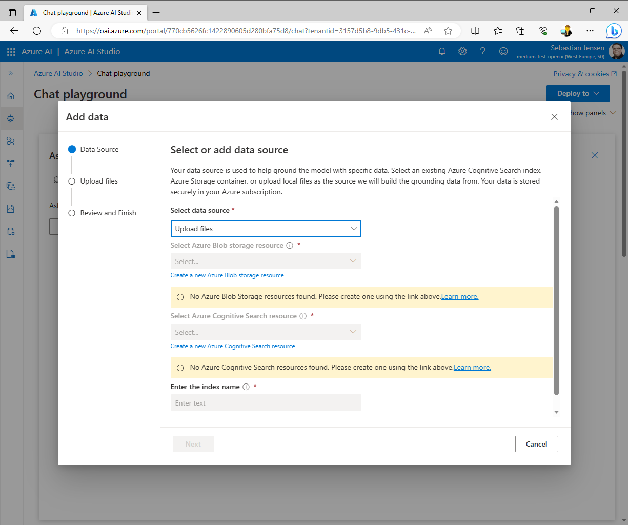 Jetzt klicke auf den Button „Add a data source“. Es gibt derzeit drei Optionen, um deine Daten hinzuzufügen: Azure Cognitive Search, Azure Blob Storage oder Upload files. Für diesen Blog-Beitrag werde ich die Option „Upload files“ verwenden. Du musst nun eine Azure Blob Storage-Ressource und eine Azure Cognitive Search-Ressource erstellen. Stelle sicher, dass du diese Dienste im selben Abonnement und in derselben Region erstellst. Achte auch darauf, eine Basisinstanz des Azure Cognitive Service zu erstellen, da die kostenlose Variante nicht unterstützt wird.