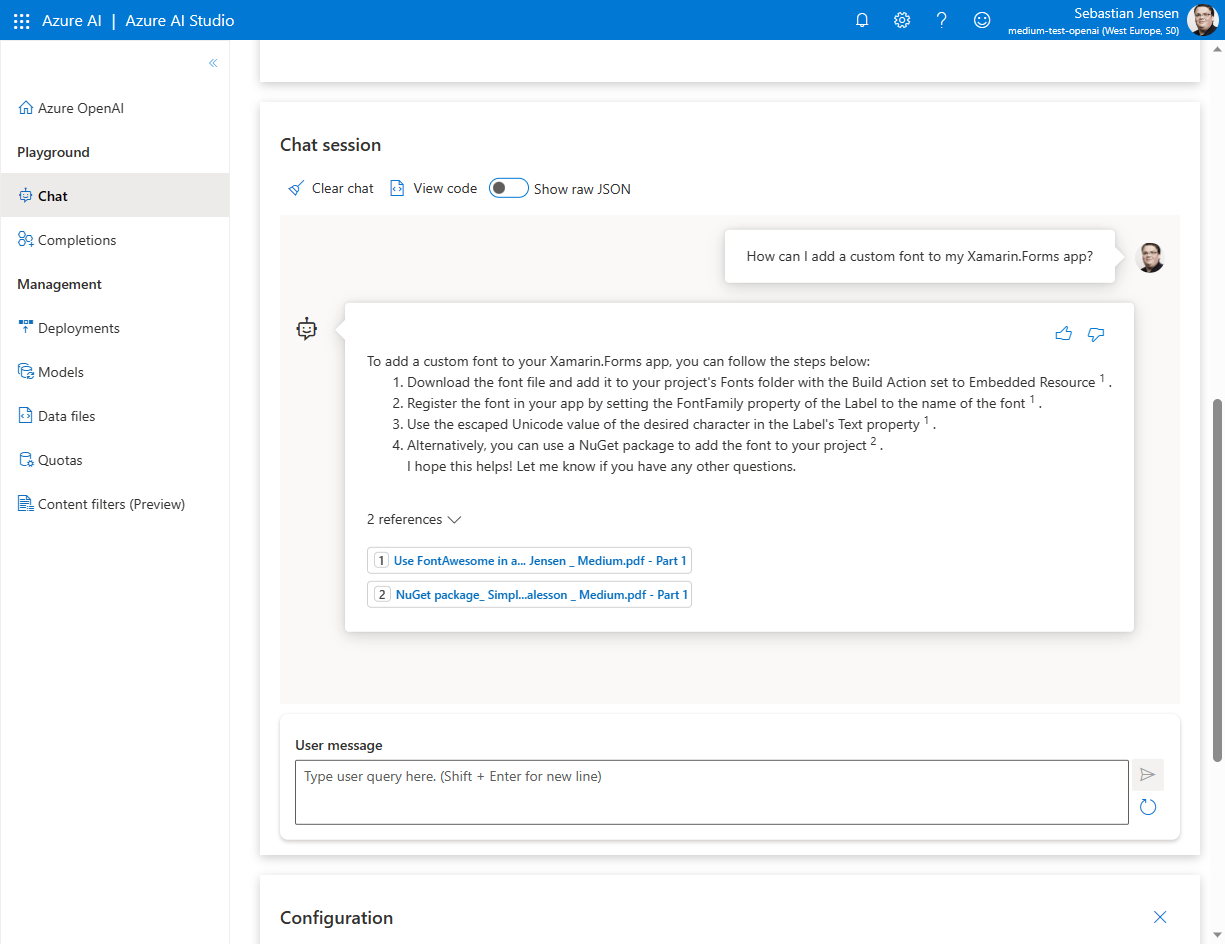 Jetzt kannst du zum Bereich „Chat-Sitzung“ wechseln und eine Konversation mit deinem individuellen Copilot starten. Ich möchte wissen, wie ich meiner Xamarin.Forms-App eine benutzerdefinierte Schriftart hinzufügen kann. Wie du sehen kannst, ist der Copilot in der Lage, diese Frage zu beantworten und die entsprechenden Verweise hinzuzufügen, damit du sicher sein kannst, dass deine Daten verwendet werden, um die Antwort zu generieren.