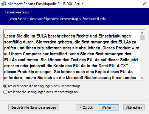 Wie bereits erwähnt konnte man die Encarta auf CD-ROM bzw. DVD kaufen. Es gab zwar auch eine Online-Version, diese wurde aber bereits vor über 10 Jahren eingestellt. Ich habe hier die Version von 2001 und möchte kurz mit euch die Installation besprechen. Überraschender Weise ist diese sogar fast 20 Jahre nach erscheinen auch noch uneingeschränkt unter Windows 10 lauffähig. Nachdem ihr die CD eingelegt habt, werdet ihr mit dem Installationsbildschirm begrüßt.
