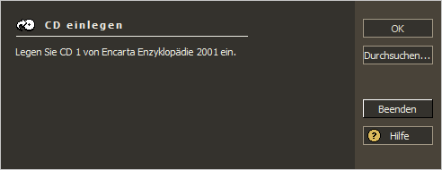 Wenn man nun das Programm starten möchte, wird man gebeten doch bitte die CD 1 einzulegen. Ihr müsst nämlich wissen, dass die Encarta aus drei CD besteht. Eine CD beinhaltet den Installationsassistenten und wurde bereits von uns verwendet und die anderen beiden CDs beinhalten entsprechend den Content der Enzyklopädie und müssen dann auch im Betrieb immer mal wieder gewechselt werden. Wir halten also fest, dass obwohl wir etwas auf dem Rechner installiert haben, stets die CDs benötigen.
