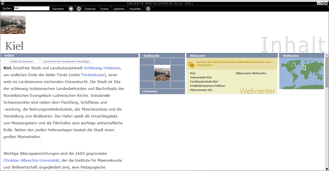 Ich habe hier nun einmal den Beitrag meiner alten Heimatstadt Kiel geöffnet. Der Aufbau ist hierbei immer recht ähnlich. Im linken Bereich gibt es einen Text, welcher an manchen Stellen auch mit einem Namen versehen wurde, so dass man genau weiß, wer diesen Text verfasst hat. Wie auch in der Wikipedia gibt es Verlinkungen zu weiteren Themen, wie zum Beispiel dem Bundesland Schleswig-Holstein oder auch der Universität zu Kiel. Im rechten Bereich gibt es dann weiterführende Informationen, wie zum Beispiel Bilder oder in diesem Fall eine Karte, um zu sehen, wo sich genau Kiel befindet. Was direkt auffällt, ist die Tatsache, dass die Artikel recht kurz gehalten sind und wirklich nur die wesentlichen Informationen zu einem Thema wiedergeben.