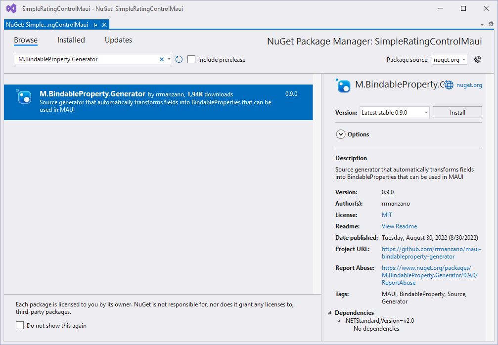 Ich nutze nun das NuGet-Package für mein SimpleRatingControl.MAUI und zeige euch in diesem Beitrag, wie viel Code man dadurch einsparen kann. Da es sich bei dem SimpleRatingControl um ein Package für .NET MAUI handelt, müssen wir das Package M.BindableProperty.Generator unserer Solution hinzufügen. Es steht aber mit X.BindableProperty.Generator auch eine Variante für Xamarin.Forms zur Verfügung.