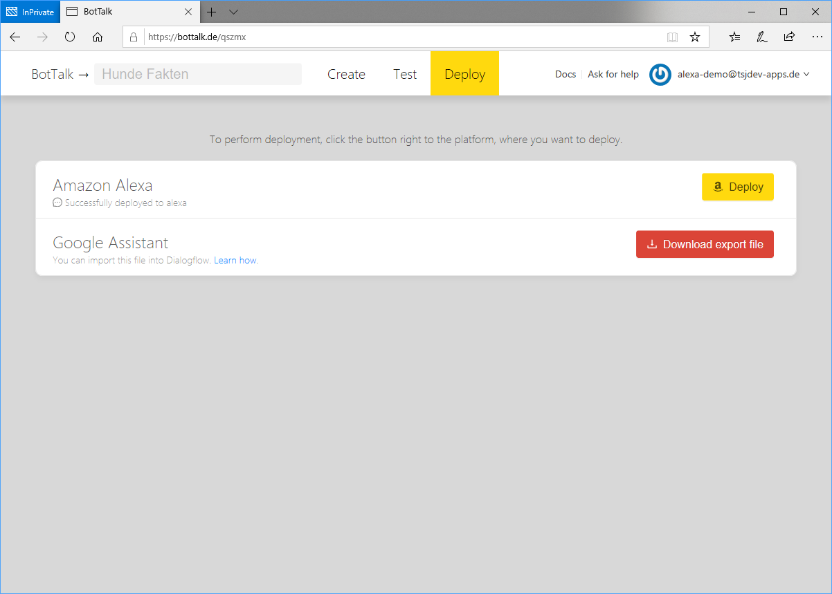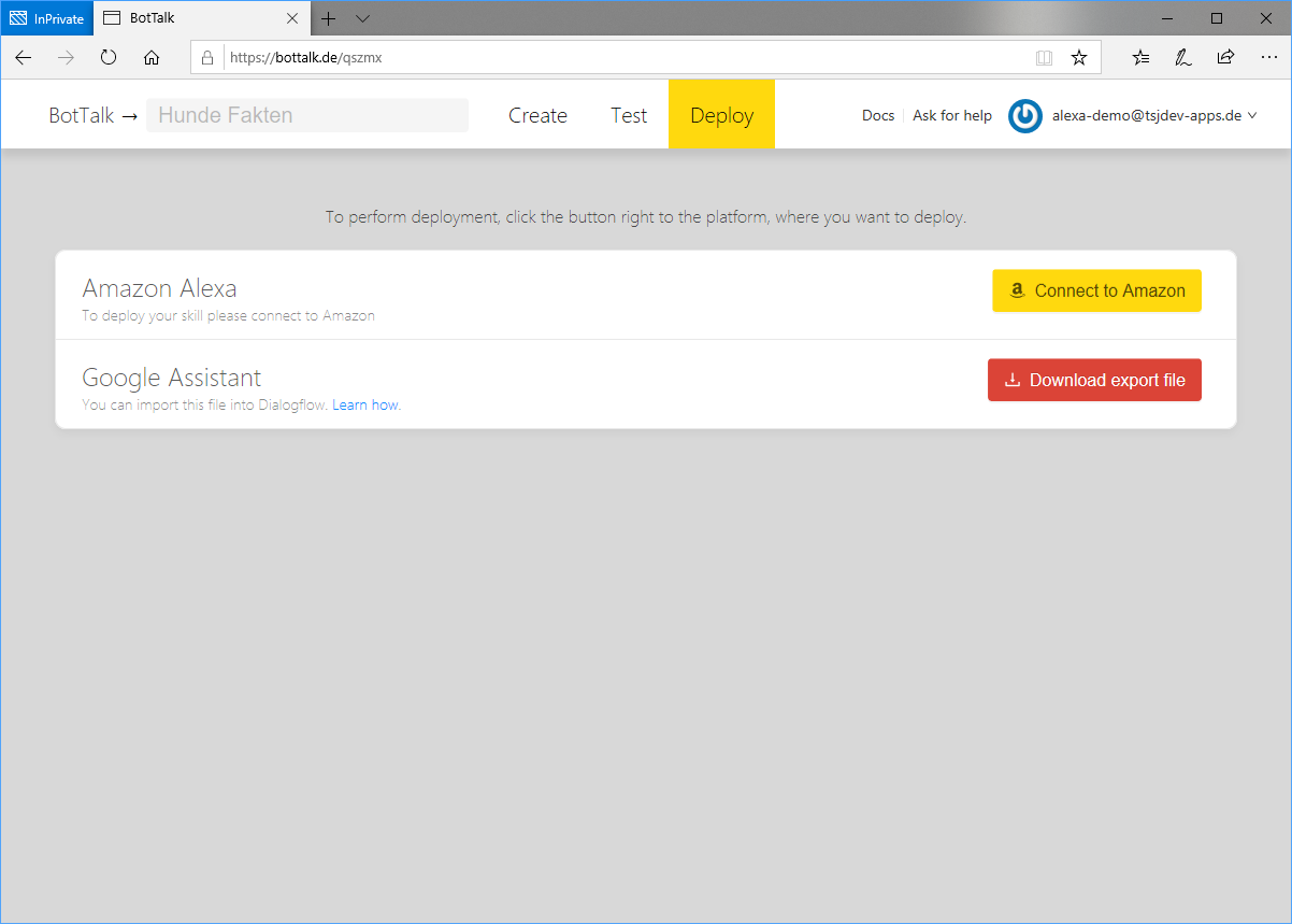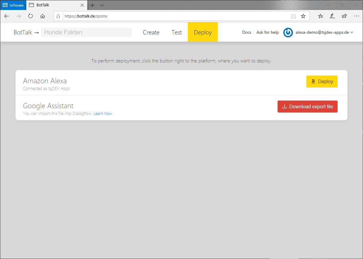Wir öffnen zunächst unseren entwickelten Skill über das BotTalk-Dashboard. Nun wählen wir in der oberen Navigation den Eintrag Deploy aus. Es stehen uns derzeit zwei Optionen Amazon Alexa und Google Assistant zur Auswahl.