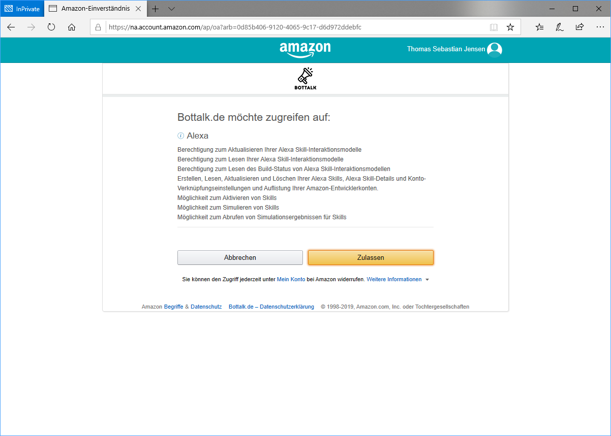 Im nächsten Schritt müssen wir die Berechtigungen setzen, so dass BotTalk entsprechend Zugriff auf die Alexa Skills bekommt und auch Skill zum Beispiel aktivieren kann oder Test-Ergebnisse abrufen kann. Die Zustimmung können wir über den Button Zulassen geben.