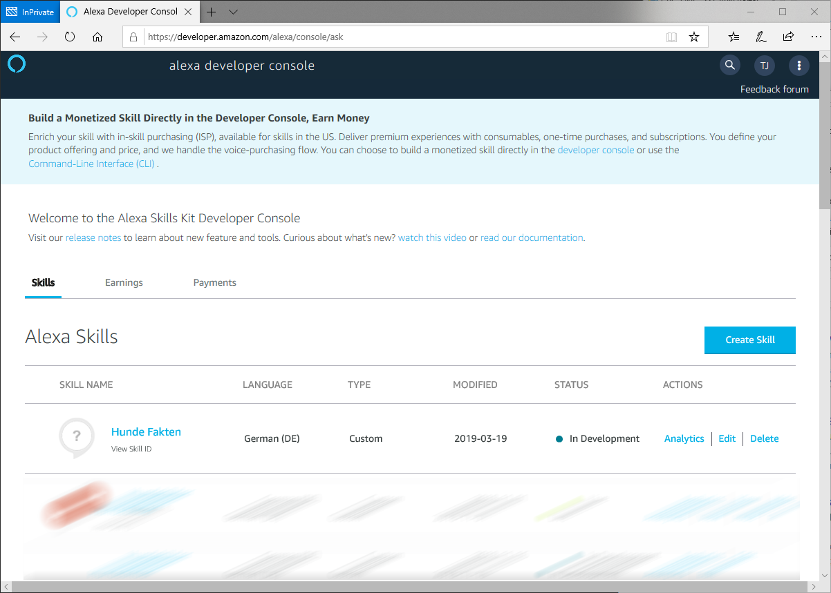 Nun können wir in das Developer-Portal von Amazon unter https://developer.amazon.com wechseln und sehen unseren mit BotTalk erstellten Skill in der Übersicht.