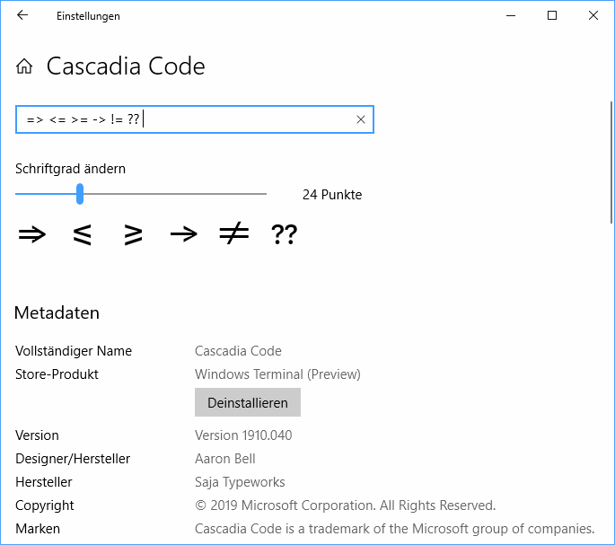 Vor mehr als zwei Jahren habe ich bereits Fira Code vorgestellt , welches Ligaturen speziell für Entwickler verwendete. Bei Ligaturen handelt es sich in der Typografie um die Verschmelzung mehrere Zeichen zu einem Schriftzeichen, wie zum Beispiel >=, => oder auch ??. Mittlerweile ist Fira Code 2 veröffentlicht worden, welche zahlreiche Verbesserungen beinhaltet. In diesem Jahr hat Microsoft die nächste Version des Windows Terminals vorgestellt, welche man auch schon seit einiger Zeit als Preview-Version aus dem Microsoft Store herunterladen kann. In diesem Zusammenhang wurde auch eine neue Schrift eingeführt, welche auf den Namen Cascadia Code hört und sich aktuell in der Entwicklung befindet.