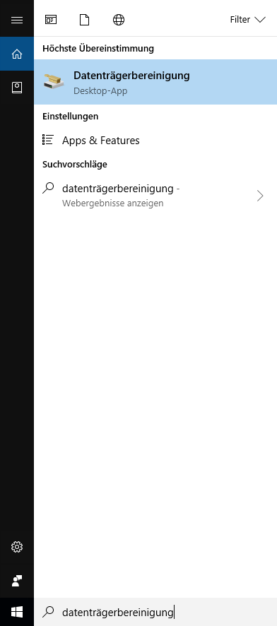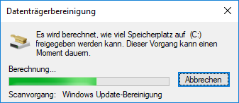 Das obige Bild zeigt den Ordner, welcher man gerne löschen möchte, um weiteren Speicherplatz zu erhalten. Dazu öffnet man das Startmenü und sucht nach dem Programm Datenträgerbereinigung.
