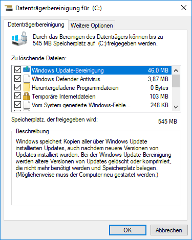 In dem Ergebnisfenster gibt es nun zusätzliche Einträge, wie zum Beispiel Windows Update Bereinigung oder auch Vorherige Windows-Installation(en). Wenn ihr hier jetzt einen Haken setzt, dann wird auch der Ordner Windows.old entfernt.