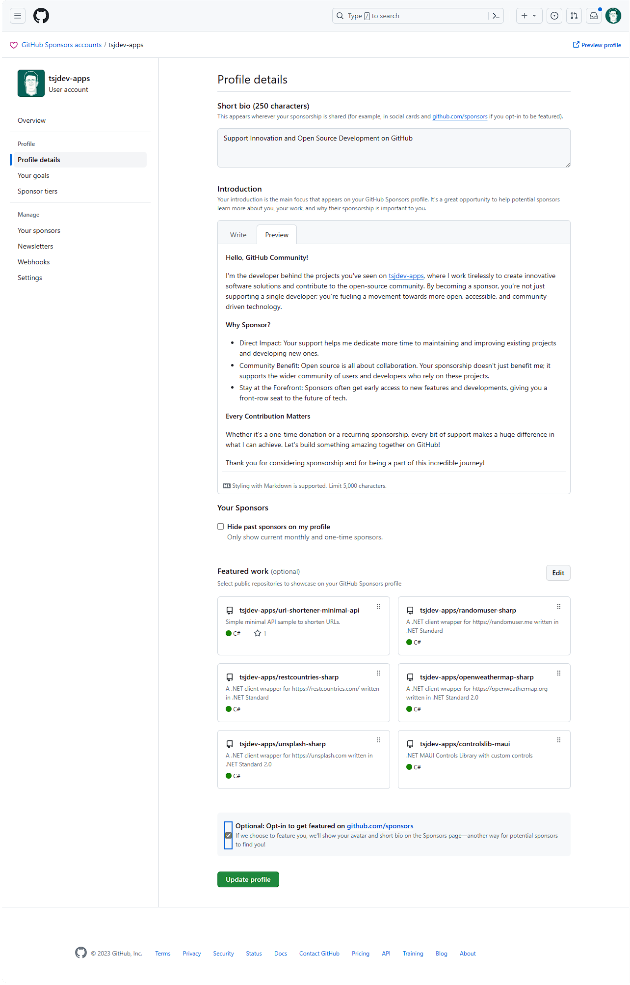 Zunächst müssen wir ein eigenes Profil erstellen und ausfüllen. Der Text ist frei wählbar und sollte erklären, warum man einen sponsern soll. Außerdem kann man noch bis zu 6 Repositories auswählen, welche in der Übersicht ansgezeigt werden.