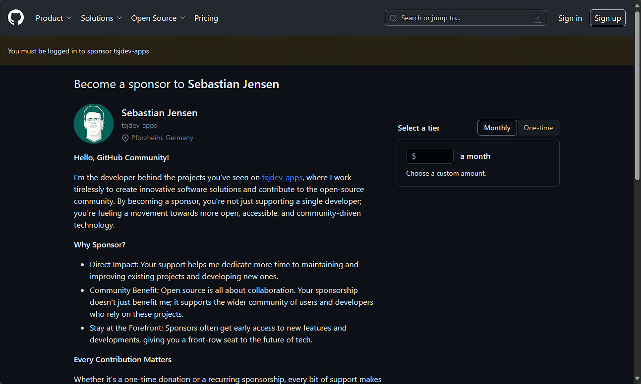 Seit einiger Zeit ist es möglich, sich über GitHub sponsern zu lassen. Dies ermöglicht Nutzerinnen und Nutzern einen Geldbetrag zu senden, um so Entwicklerinnen und Entwickler zu unterstützen. Ich habe für mein GitHub-Profil nun einmal GitHub Sponsors eingerichtet und möchte euch in diesem Beitrag nun zeigen, wie man das Ganze in wenigen Schritten selbst einrichten kann.