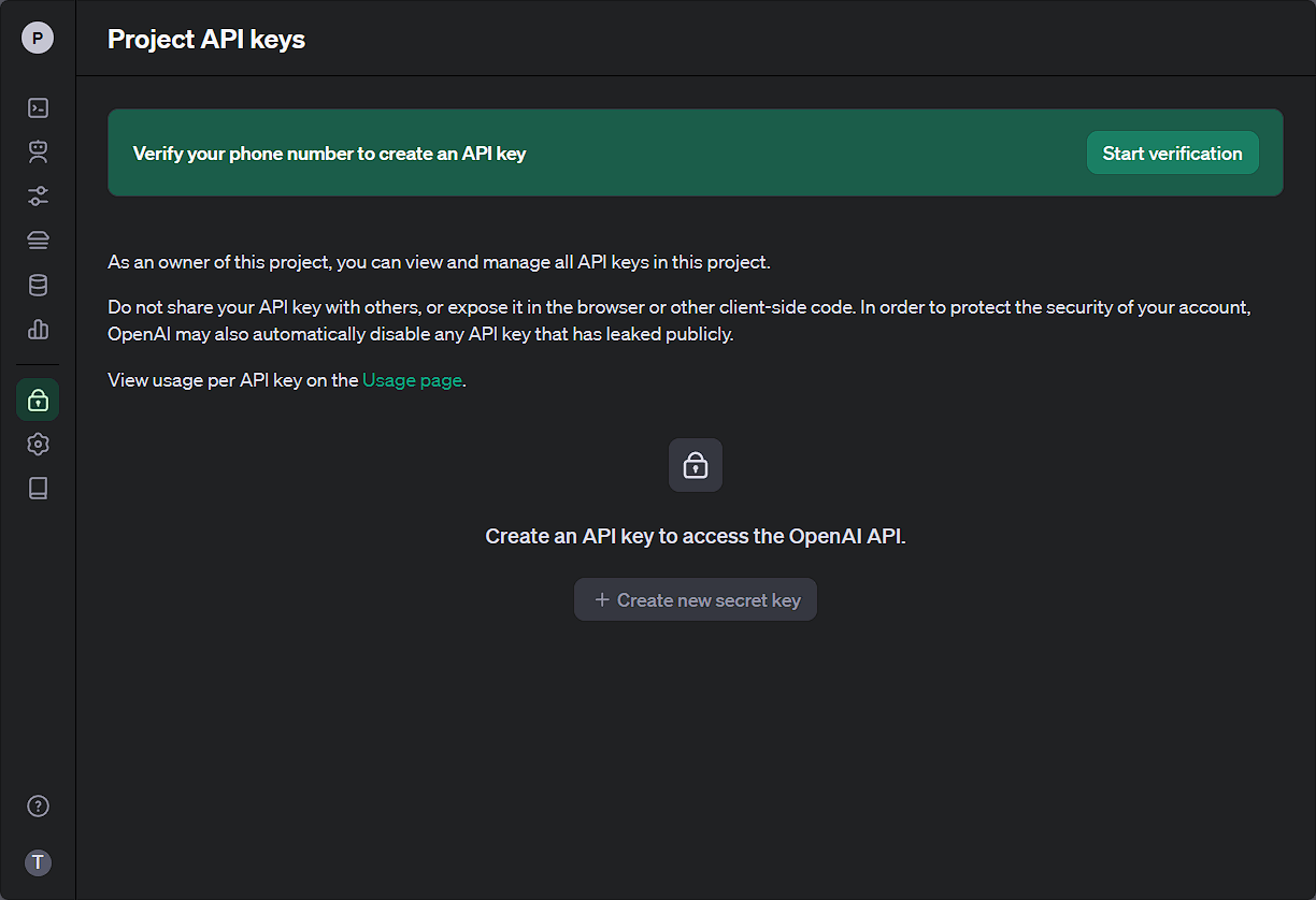 Nun müssen wir einen API Key erstellen. Dazu wechseln wir in den Abschnitt API Keys in der linken Menüleiste. Die obere Box weist darauf hin, dass ihr noch eine Handynummer hinterlegen müsst. Wenn ihr eine “neue” Handynummer angebt, so erhaltet ihr ein kostenloses Kontingent, um mit der API zu experimentieren. Solltet ihr eine bereits vorhandene Handynummer angeben, so bekommt ihr dieses Kontingent nicht.