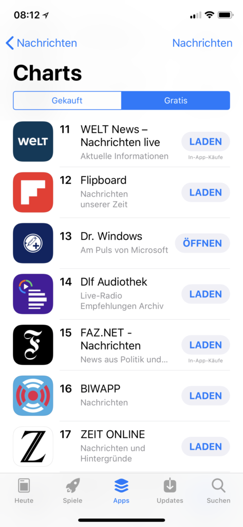 An dieser Stelle auch einen herzlichen Dank an alle Nutzer der App, denn diese Zahlen freuen mich wirklich sehr und auch das Feedback, welches ich bisher erhalten habe, war durchaus positiv. Beim Launch der Dr. Windows App im Apple App Store haben wir es sogar auf Platz 13 in den Charts geschafft noch vor der FAZ oder der Zeit.