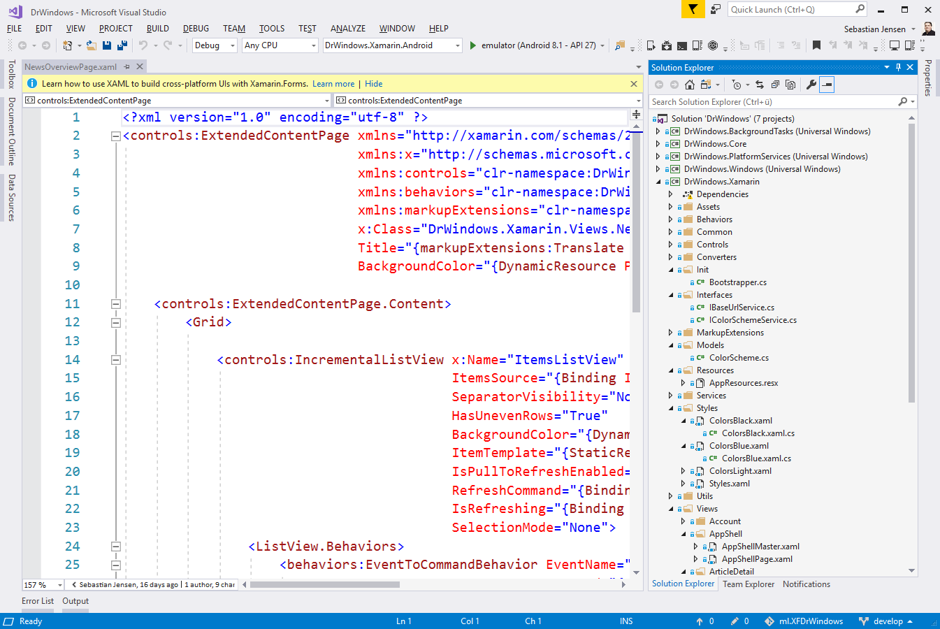 Nach einigen internen Überlegungen und ersten kleineren Test-Apps habe ich mich dann dazu entschieden den UWP-Teil unberührt zu lassen und ein Xamarin.Forms-Projekt anzulegen, welches dann die Logik und das Design für die iOS- und die Android-Version beinhaltet. Zum Entwicklungsstart hat Xamarin gerade von der Portable Class Library auf .NET Standard umgestellt, so dass der erste Schritt die Migration der bestehenden Business-Logik auf .NET Standard war. Anschließend habe ich dann View für View versucht nachzubauen. Hierbei bin ich wieder auf kleinere Problemchen gestoßen, welche eine 1-zu-1-Portierung des bestehenden XAML-Codes nicht möglich gemacht haben, aber durch kleinere Anpassungen konnten auch diese Probleme gelöst werden.