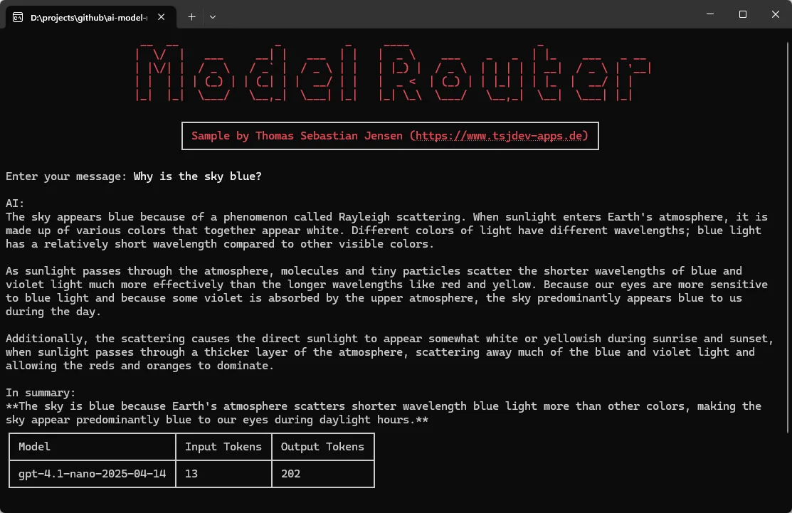 Sobald die Konfiguration abgeschlossen ist, startet die Anwendung eine Chat-Schleife. Dabei wird der komplette Verlauf an den Model Router gesendet – und die Antwort der KI wird in Echtzeit angezeigt. Am Ende jeder Nachricht bekommst du außerdem Infos darüber, welches Modell verwendet wurde und wie viele Tokens für Eingabe und Ausgabe verbraucht wurden.