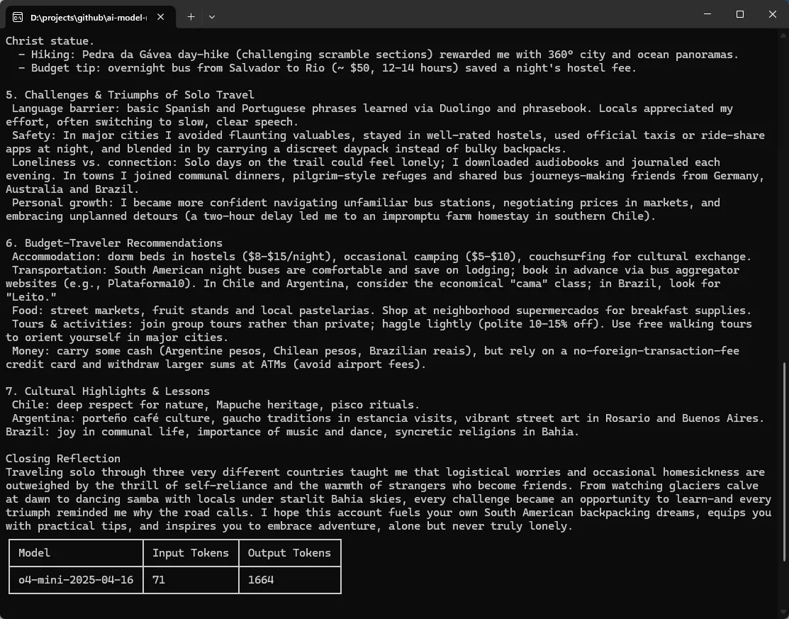 Versuchen wir nun einen komplexeren, offenen Prompt: „Schreibe einen ausführlichen Bericht über ein Solo-Backpacking-Abenteuer durch Südamerika – mit Stationen in Chile, Brasilien und Argentinien. Beschreibe die Herausforderungen und Erfolge des Alleinreisens, Begegnungen mit Einheimischen und die kulturelle Vielfalt, die du erlebt hast. Erwähne Highlights, besondere Erlebnisse wie Wanderungen und gib Tipps für Reisende mit kleinem Budget.“