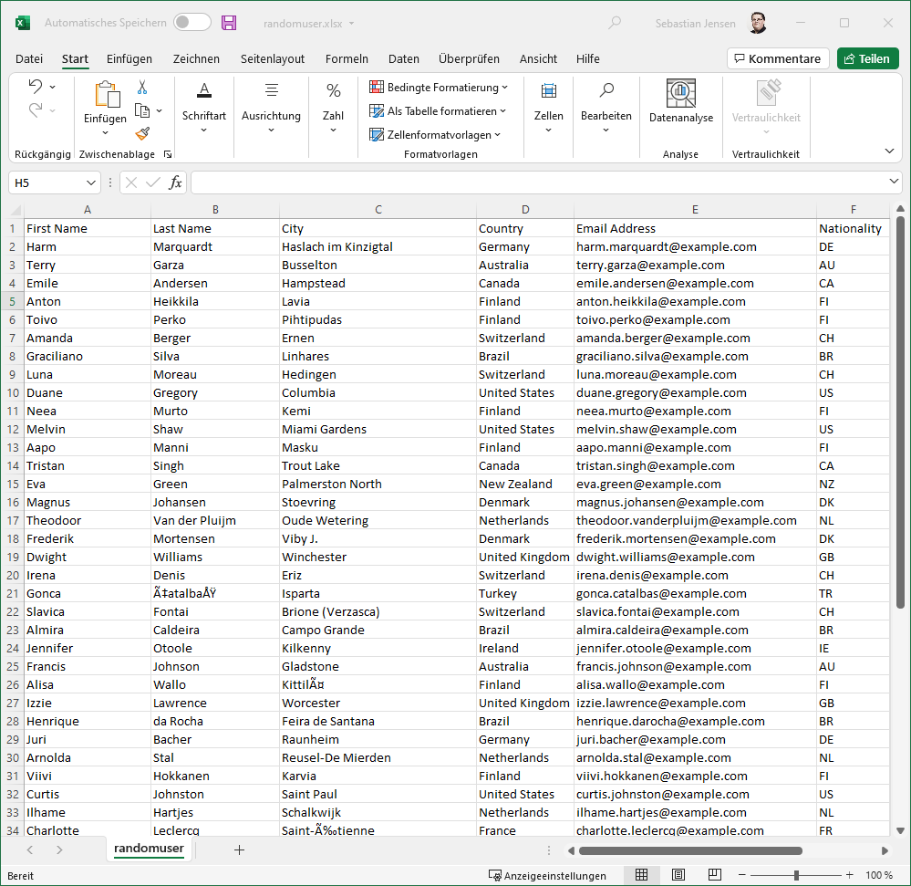 Um die Webseite nun auch testen zu können, habe ich mir eine kleine Excel-Tabelle erstellt, welche zufällige Nutzerdaten beinhaltet. Zu beachten ist, dass die erste Zeile die Kopfzeile ist und man am besten ganz oben links beginnen sollte, damit das Tool alles sauber konvertieren kann.