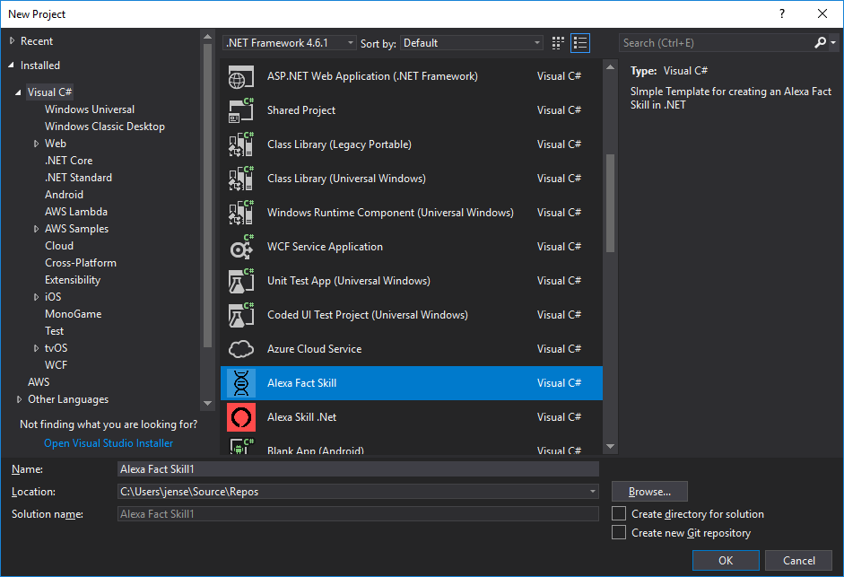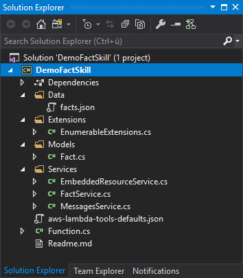 Wenn wir nun dieses TemplateAlexa Fact Skill auswählen, können wir direkt einen Namen für die Solution vergeben und mit OK bestätigen. Wir erhalten dann den folgenden Projekt-Aufbau.