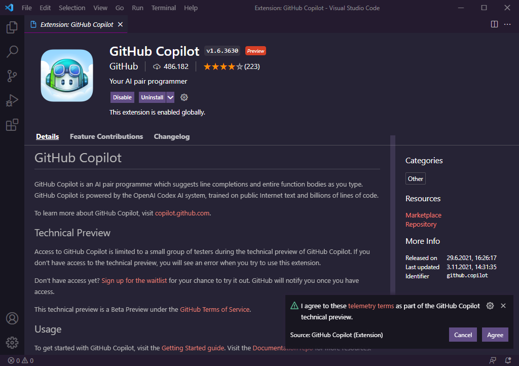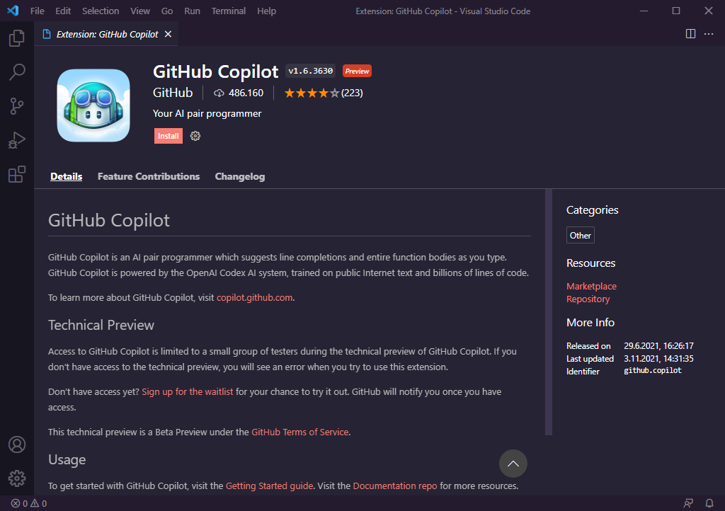 Zunächst muss man sich für die Technical Preview registrieren und damit in einer Warteliste Platz nehmen. Ich habe dann einige Zeit später eine eMail bekommen, dass ich nun Zugriff aufGitHub Copilot mit der Hilfe meines GitHub-Accounts habe. In diesem Beitrag zeige ich euch nun GitHub Copilot in Visual Studio Code. Dazu müssen wir Visual Studio Code öffnen und nach der Extension GitHub Copilot suchen und diese installieren.