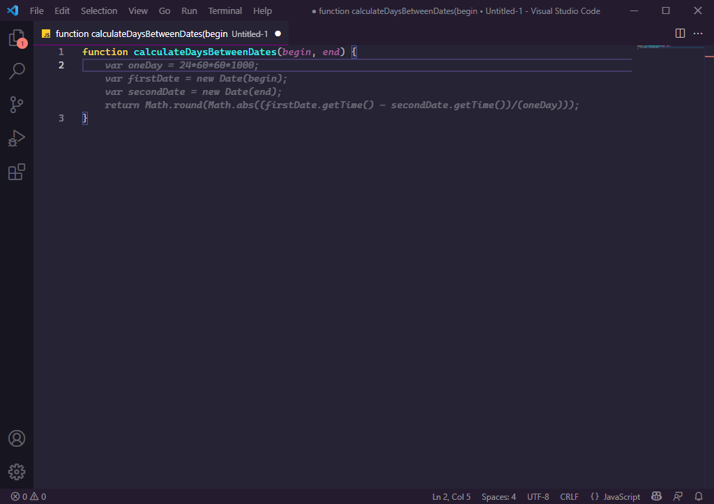 Nun ist es soweit und wir sehen am rechten unteren Bereich ein kleines zusätzliches Icon. Ich habe nun eine leere JavaScript-Datei angelegt und begonnen eine Funktion zu schreiben, welche die Anzahl der Tage zwischen zwei übergebenen Daten berechnen soll. Bereits nach einigen Millisekunden wird nun der vollständige Code für die Methode durch GitHub Copilot vorgeschlagen und kann durch das Drücken der Tab-Taste auch direkt übernommen werden.
