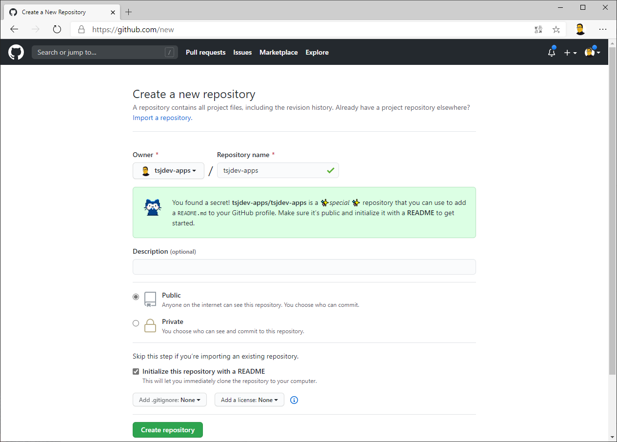 Als Namen für das Repository müssen wir nun den eigenen GitHub-Usernamen angeben. Sobald dies passiert wird einem bereits in einer grünen Info-Box mitgeteilt, dass man das Repository verwenden kann, um eine eigene README-Datei im GitHub-Profil anzeigen zu lassen. Wichtig ist, dass das Repository öffentlich ist und ihr solltet die Checkbox beim Anlegen der README anhaken.