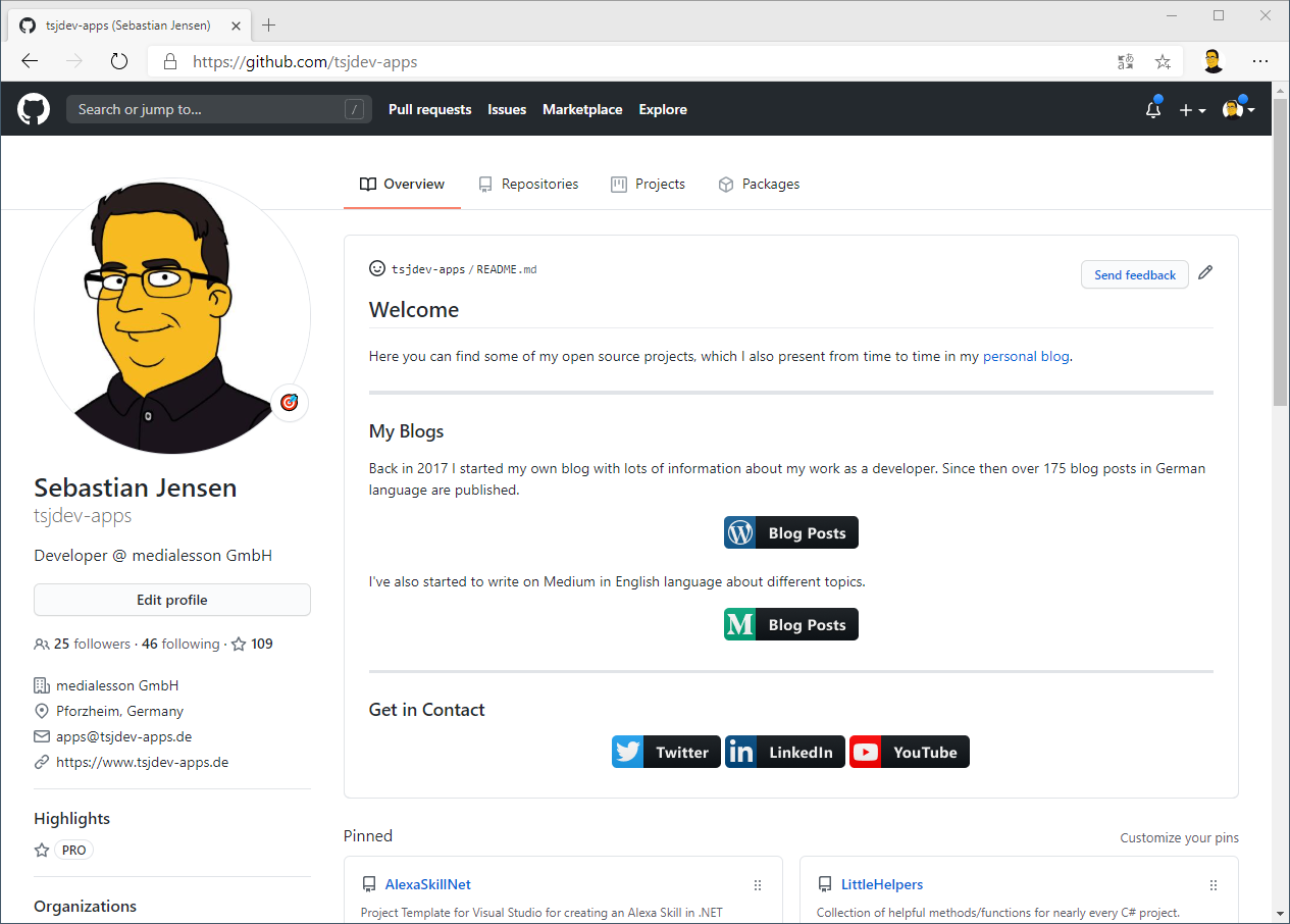 Der folgende Screenshot zeigt mein aktuelles GitHub-Profil. Ich habe hier auf meinen Blog und auf meine sozialen Netzwerke hingewiesen. Mal schauen, was ich hier noch in naher Zukunft als weitere Informationen anzeigen werde.