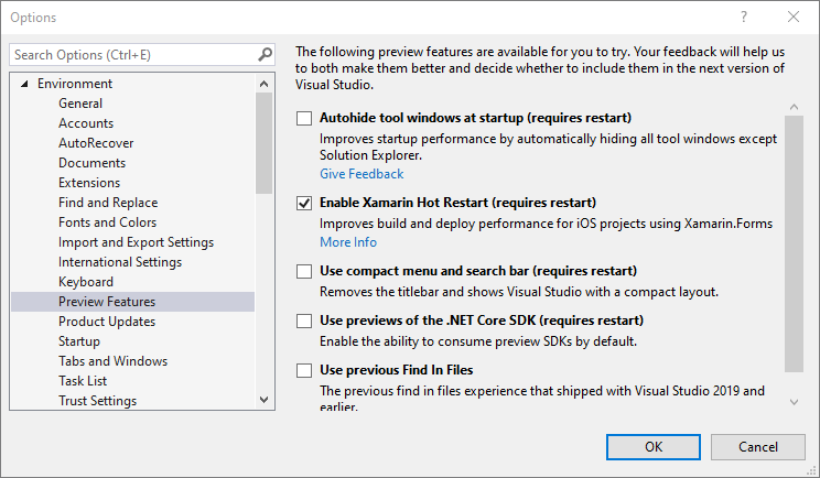 An dieser Stelle sei noch angemerkt, dass ihr einen Apple Developer Account benötigt, aber sofern dieser vorhanden ist, ist die Einrichtung relativ simpel. Zunächst öffnet ihr die Optionen in Visual Studio und wählt unter Environment > Preview Features den Eintrag Enable Xamarin Hot Restart (requires restart) aus.