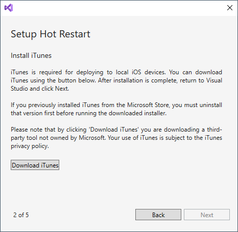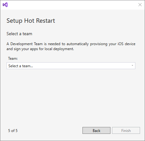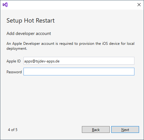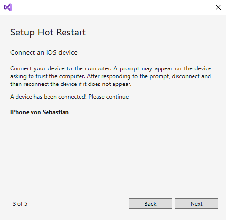 Anschließend startet ihr Visual Studio neu und öffnet euer Xamarin.Forms Projekt. Schließt nun euer iPhone oder iPad an euren Windows-Rechner an und folgt den Hinweisen auf dem Screen. Setzt nun das iOS-Projekt als Startprojekt. Dann erscheint auf dem Ausführen-Button der Eintrag Local Device. Es öffnet sich ein Dialog, welcher euch durch die Einrichtung von Xamarin Hot Restart hilft.