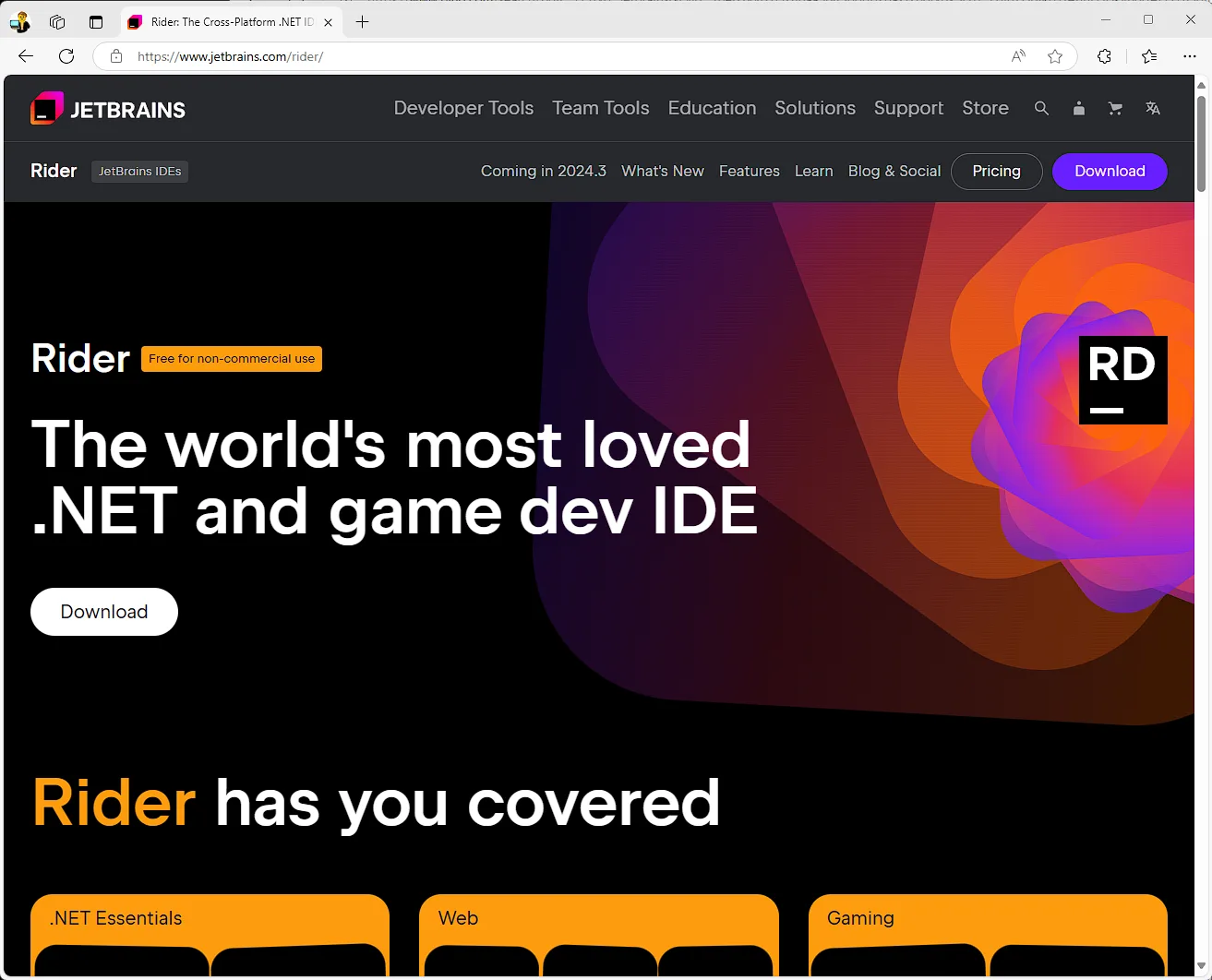 Zunächst öffnen wir die JetBrains-Webseite unter https://www.jetbrains.com/rider/ und dort klicken wir auf den Download-Button.